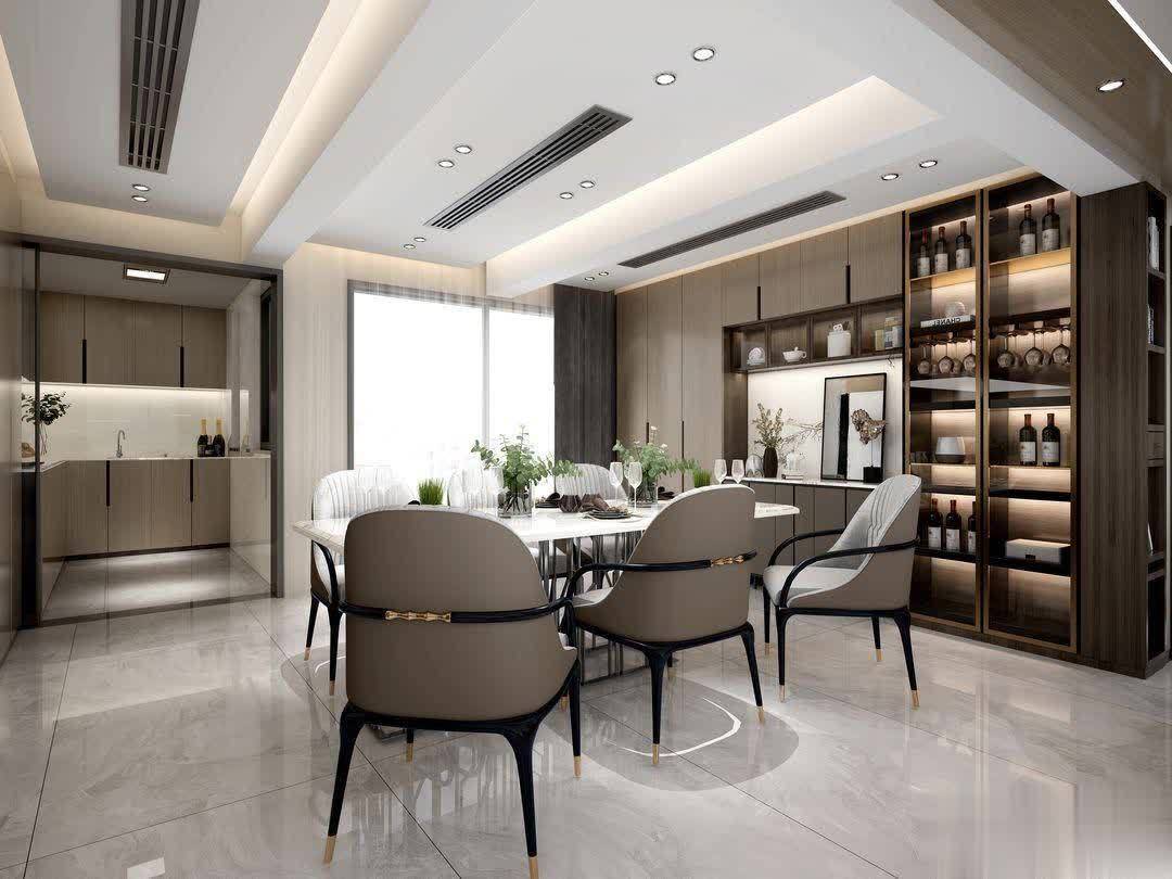 表面带有矿石般的个性化肌理和粗糙的天然质感理石,使餐桌看起来纯朴加自然,散发着浓厚的艺术气息,又独具个性,配置的餐椅也以原生木加金属的现代设计,高高的酒柜设计实用大方,储物空间丰富,辅以暖色灯带,促其成为生活舞台的浪漫一隅。