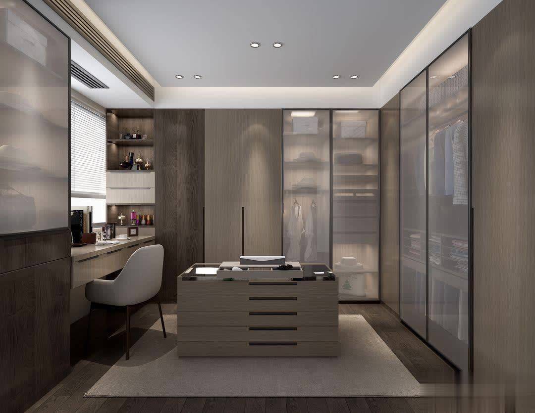 三面环绕的U型设计,保证了动线与光线的畅通,非透明与透明门体共同存在于空间,暖咖的色系尽显质感与低调,地柜与高柜贯穿整体,丰富必备的妆台布置,将精致的衣帽空间除了基本的收纳外增加了浪漫的生活仪式。