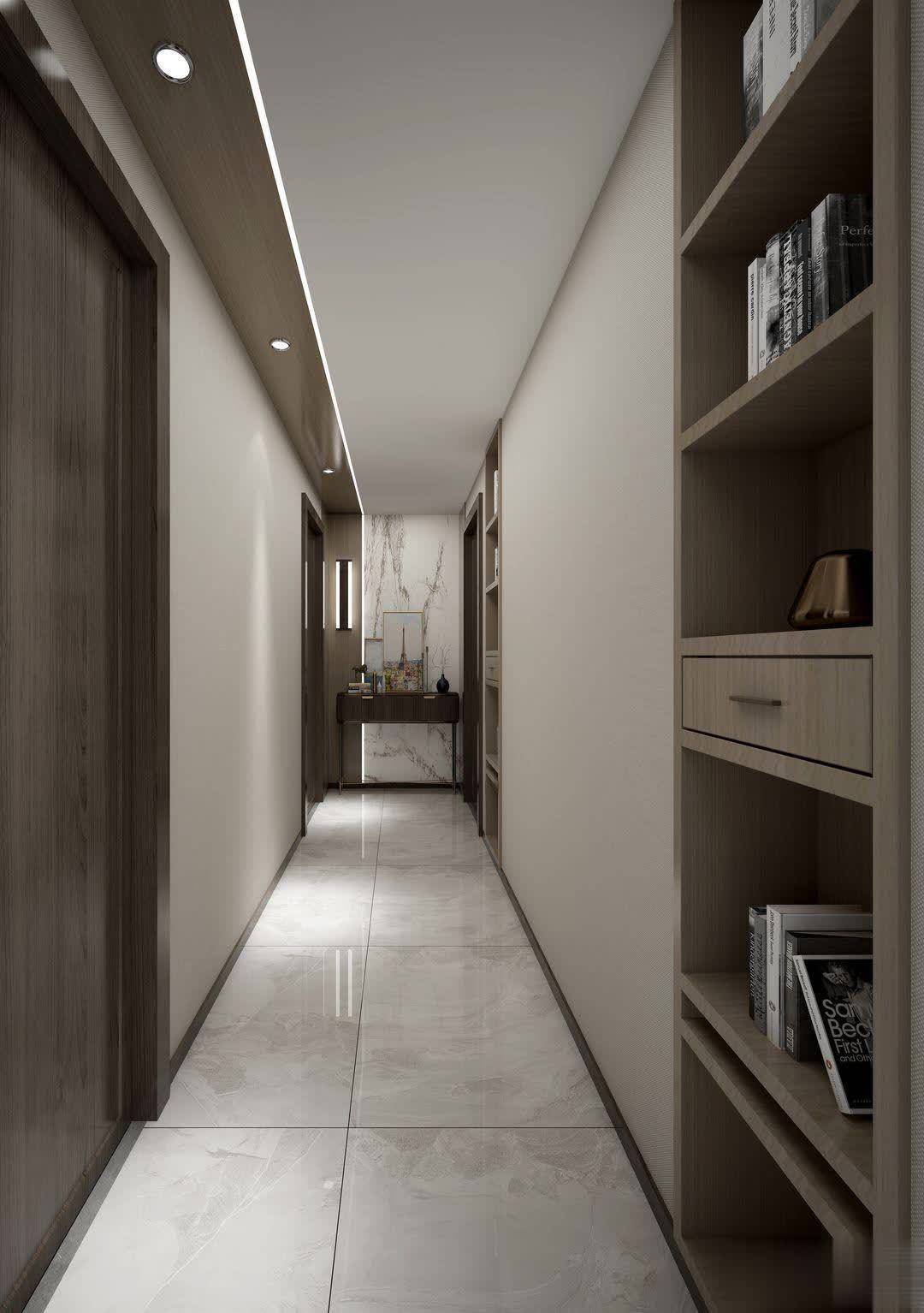 以入口的角度审视门廊,它承载了居室间的连接,又是独立不受打扰的存在,不用夸富的形式表现,只是低吟生活的朴素,虽是简短的“路过”停留的一秒便知它的美好,木料的天然温度,伴着书本的烘托,柔柔的灯光下,可以驻留很久,尽头是主人可以全情展现格调的艺术区。