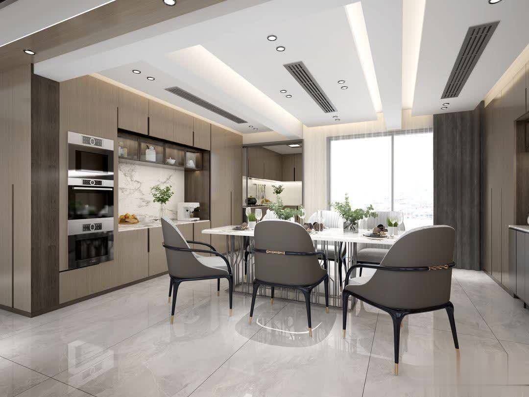 L型布局是当下厨房常见形式,虽是开放餐厅但操作分区明确,充足的柜体收纳以及不同功能的嵌入式电器将其最大化应用日常。中间结合餐桌的设计,哑光处理显得格外冷静、低调,营造更灵活更实用的餐厨空间。