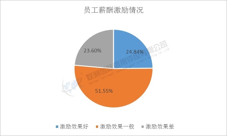 在员工薪酬激励方面,有24.84%的公司员工薪酬高于行业平均水平,对员工的激励效果好;有51.55%的公司员工薪酬和行业平均水平持平,对员工的激励效果一般,有23.60%的公司员工薪酬低于行业平均水平,对员工的激励效果差,基层员工离职率高。