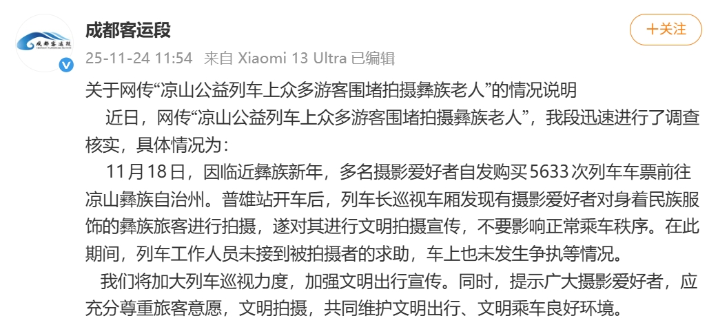11月18日,因临近彝族新年,多名摄影爱好者自发购买5633次列车车票前往凉山彝族自治州。普雄站开车后,列车长巡视车厢发现有摄影爱好者对身着民族服饰的彝族旅客进行拍摄,遂对其进行文明拍摄宣传,不要影响正常乘车秩序。在此期间,列车工作人员未接到被拍摄者的求助,车上也未发生争执等情况。